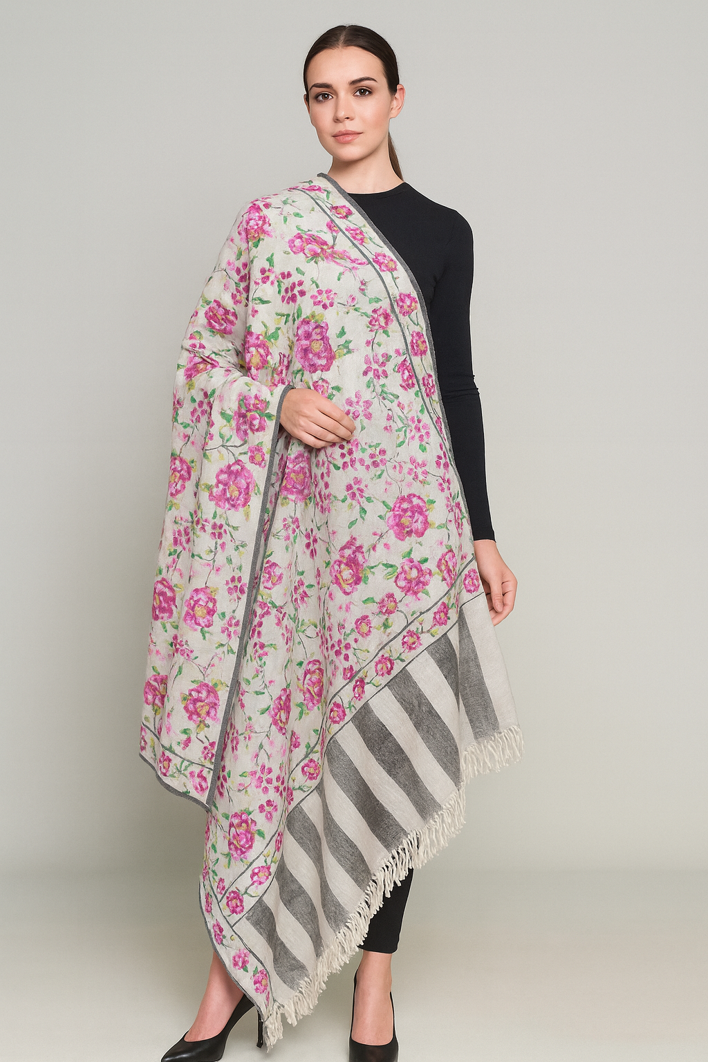 The result is a mesmerizing tapestry of intricate motifs and graceful colors — a celebration of heritage, craftsmanship, and elegance. With its soft texture and generous drape, this shawl offers warmth without weight, making it perfect for both everyday sophistication and special occasions.